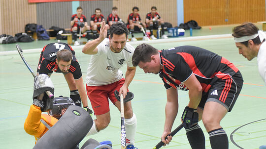 Im Hinspiel setzten sich Sebastian Behr (Mitte) und sein Kreuznacher HC mit 14:6 gegen Eintracht Frankfurt durch. Nun steht das Rückspiel an, das für beide Teams von großer Bedeutung ist. Klaus Castor