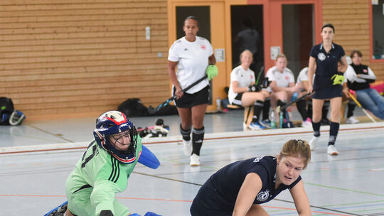Auf dem Sprung zum Sieg beim Fedi-Cup: Die Spielerin des VfL Bad Kreuznach (blaues Trikot) gibt im Duell mit Eintracht Frankfurt alles dafür, einen Treffer zu erzielen. Klaus Castor