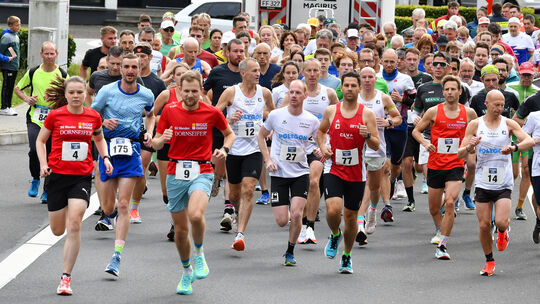 37. Götzelauf der DJK Herdorf – 7. Lauf zum Ausdauer-Cup 2025. Start zum Hauptlauf über 10 Kilometer – zu erkennen (von links): Die spätere Siegerin Judith Hacker (Nr. 4/SG Wenden), Maximilian Ferger (Nr. 75/WSG Bad Marienberg), Matthias Nebe (Nr. 9/SG Wenden), Stefan Brockfeld (Nr. 12/TuS Deuz), Jonas Winkel (Nr. 27/TuS Deuz), Jens Raupach (Nr. 77/CLV Siegerland), der spätere Sieger Markus Mockenhaupt (Nr. 7/SG Wenden), Viktor Horch (Nr. 14/TuS Deuz) und Aleksei Nesterov (Nr. 15/TuS Deuz). Frank Steinseifer
