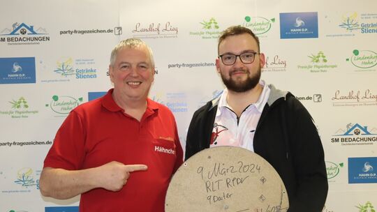2024 beim ersten Ranglistenturnier beim Steeldart-Verein "Hähnchens Dart Farm" in Blankenrath warf Leon Weber (rechts) aus Nastätten einen Neun-Darter und wurde von Organisator Michael Hahn beglückwünscht. Weber hat seitdem einen rasanten Aufstieg hinter sich, mittlerweile ist er die Nummer 110 der Welt. Bei der WM in London ist er aber nicht dabei, dafür aber eventuell wieder beim Ranglistenturnier am Samstag in Blankenrath. Michael Hahn
