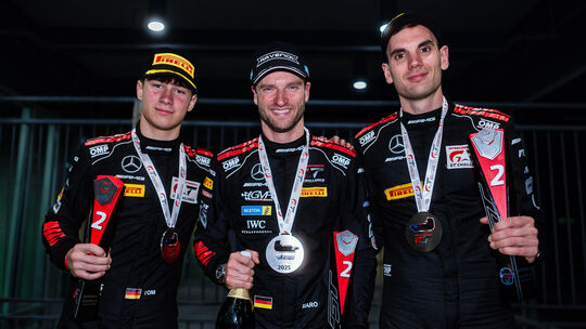 Ein fast perfektes IGTC-Finale endete für das AMG-Trio Tom Kalender, Maro Engel und Luca Stolz (von links) mit Rang zwei auf dem Siegerpodium beim 8-Stunden-Rennen in Indianapolis. Jürgen Augst/AMG-Motorsport/byJogi