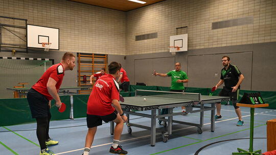 Der TuS Dichtelbach II (links mit Torsten Musshoff und Levin Cziommer) gewann das Derby beim SV Beltheim (von rechts mit Fabian Michel und Lothar Kaster) deutlich mit 7:3. Musshoff und Cziommer gewannen auch ihre Doppelpartie gegen Michel und Kaster klar mit 3:0 Sätzen. Mark Dieler