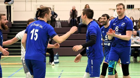 Viele Gründe zum Jubeln: Die Volleyballer des TV Feldkirchen (in Blau) rollten über Langens Reserve beim Heimsieg hinweg. Jörg Niebergall