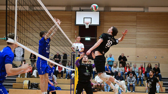 Jonas Bach (beim Angriffsschlag) und die LAF Sinzig haben das Regionalligaderby gegen den TV Feldkirchen (in Blau) mit 3:1 gewonnen. Martin Gausmann