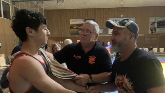 Anweisungen: VfL-Ringer Toghrul Rüstamli (von links) wird von VfL-Chefcoach Karl-Heinz Helbing und seinem Vater Panah Rüstamli, einem ehemaligen Spitzenringer und Mitglied des Trainerteams der Nationalmannschaft von Aserbaidschan, eingestellt. Oliver Eich