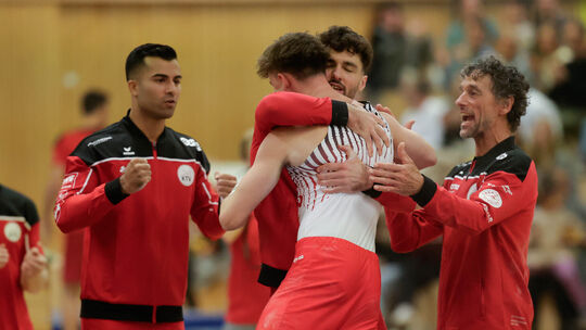 Allen Grund zum Jubeln hatten die Koblenzer Kunstturner um Trainer Ralf Schall (rechts): Durch den Sieg in Oberhausen und die Niederlage von Konkurrent Metropole Ruhr ist die KTV vorzeitig Meister der 2. Liga Nord und kämpft nun um den Aufstieg in die Bundesliga. Wolfgang Heil