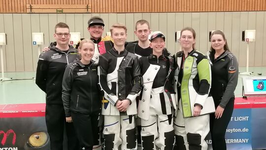 Am zweiten Wettkampfwochenende konnte der Wissener SV (von links: Benedikt Mockenhaupt, Anna Nielsen, Max Ohlenburger, Jasper Johansson, Marvin Giegling, Sophie Scholz, Franziska Stahl, Tamara Zimmer) noch aus dem Vollen schöpfen. An diesem Wochenende werden nicht alle Schützen dabei sein können. Sie weilen stattdessen bei der WM. Burkhard Müller