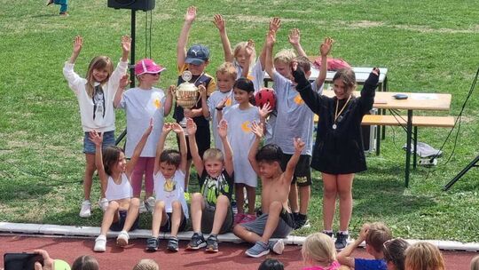 Die Schülerinnen der Klasse 1 c der Grundschule Hahnstätten bekamen einen großen Wanderpokal für die meisten Finisher. 14 Schülerinnen und Schüler erreichten beim „SophieTri“ das Ziel. Foto: Manuel Knie/SHG Manuel Knie/SHG