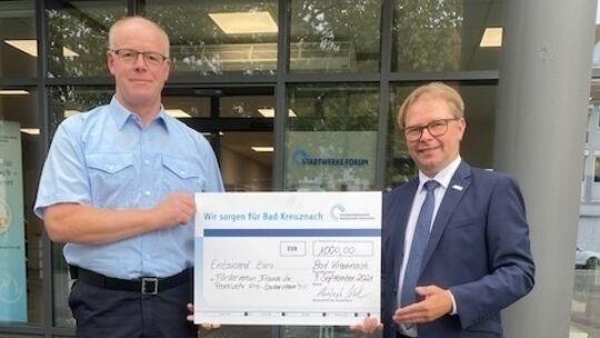 „Wir sorgen für Bad Kreuznach – und unterstützen die Feuerwehren der Verbandsgemeinde, die zuletzt mit viel Einsatzbereitschaft im Katstrophengebiet an der Ahr Hilfe geleistet haben“, sagt Christoph Nath, Geschäftsführer der Kreuznacher Stadtwerke, bei der Scheckübergabe an Bernd Vogel, Wehrleiter der VG Bad Kreuznach und Wehrführer der Feuerwehr Frei-Laubersheim.